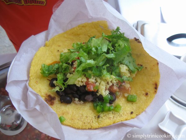 The stall that caught our fancy was Casa de Salina. They had food that was innovative but still trini to its core. There was Guava barbecue chicken, Bucaneer Pork with Stir fried veggies, Cheesey Mashed Potatoes, Bucaneer Madras Lamb, Pineapple Rice, Cherry Rice, Herbed Dasheen, Green fig salad, Plantain….Now you see why I decided to buy at this stall. We wanted to taste everything on the menu so my friend Orson bought the Guava Barbecue chicken, with pineapple rice etc,…I bought the Bucaneer Pork with Cherry Rice, fig salad etc and my friend Seeta bought the Bucaneer Madras Lamb etc….